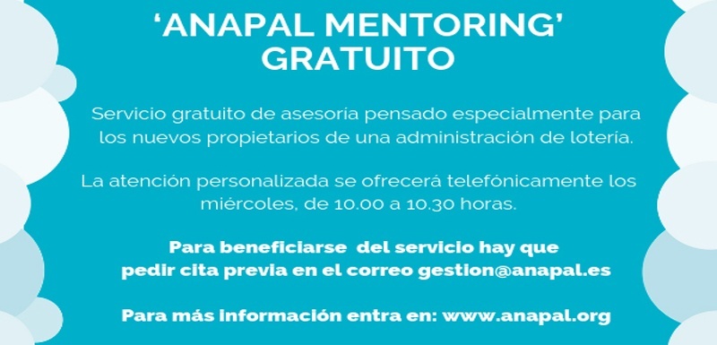 A través de esta iniciativa ANAPAL pone a disposición de los nuevos propietarios de una administración, sean socios o no, a un miembro de la Asociación con experiencia en el funcionamiento de actividades relacionadas con Loterías y apuestas. Para beneficiarse gratuitamente del servicio hay que pedir cita previa en el correo gestion@anapal.es. La atención personalizada se ofrecerá telefónicamente en el teléfono (+34) 96 354 79 33, los miércoles, de 10.00 a 10.30 horas.