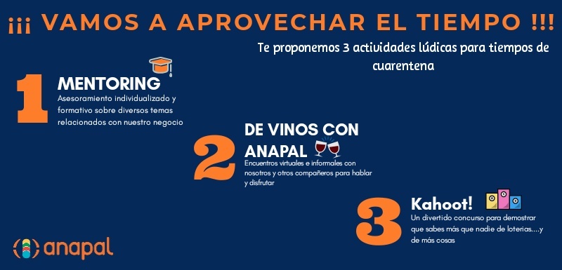 Durante este periodo de confinamiento, desde ANAPAL estamos trabajando buscando soluciones a los problemas que van surgiendo en la gestión de nuestro negocio en esta crisis. Hemos ido publicando en que estamos trabajando y en próximos días os informaremos de más iniciativas que estamos desarrollando con otras asociaciones.